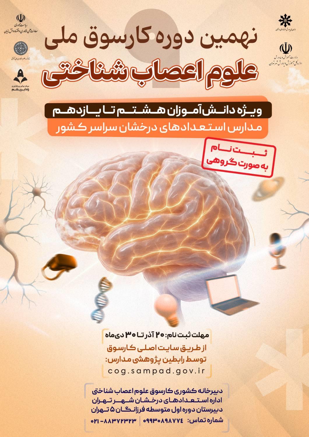 نهمین دوره کارسوق ملّی علوم اعصاب شناختی با همکاری سازمان ملّی پرورش استعدادهای درخشان و ستاد توسعه علوم و فناوریهای شناختی و به میزبانی دبیرستان فرزانگان ۵ تهران برگزار میشود. این رویداد ویژه دانشآموزان پایههای هشتم تا یازدهم مدارس استعدادهای درخشان سراسر کشور طراحی شده و بر ترویج فرهنگ پژوهش، تجهیز به دانش و مهارتهای پژوهشی و آشنایی با حوزه میان رشتهای علوم اعصاب شناختی تمرکز دارد؛ جایی که فرآیندهای شناختی مانند یادگیری، حافظه، توجه و تصمیمگیری از منظر ساختار و عملکرد مغز بررسی میشود. اهداف اصلی این کارسوق شامل: شناسایی استعدادهای برتر، آشنایی با دانش پایه و رشتههای دانشگاهی مرتبط، ارتقای مهارتهای گروهی و پژوهشی و تقویت نشاط علمی دانشآموزان است.