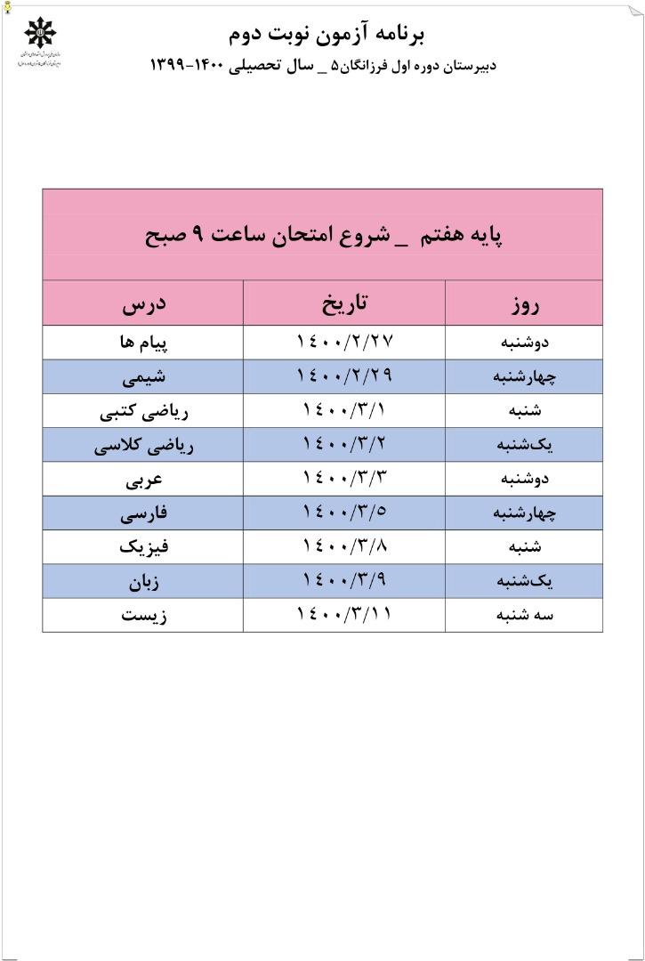 برنامه امتحان نوبت دوم پایه هفتم
